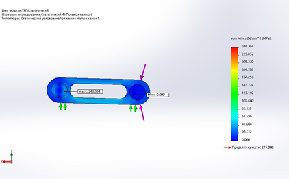 равная 18867,0,8 Н. На эпюре видно, что максимальное напряжение равно 246,384 Н/мм2 и не превышает предел текучести 275 Н/мм2.