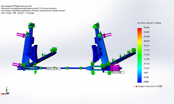 равная 18867,0,8 Н. На эпюре видно, что максимальное напряжение равно 54,485 Н/мм2 и не превышает предел текучести 275 Н/мм2.