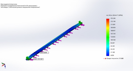 приложена к боковой грани поперечины. На эпюре видно, что максимальное напряжение равно 253,266 Н/мм2 и не превышает предел текучести 275 Н/мм2.
