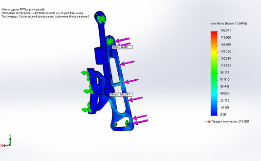 равная 37734,165 Н. На эпюре видно, что максимальное напряжение равно 196,341 Н/мм2 и не превышает предел текучести 275 Н/мм2.