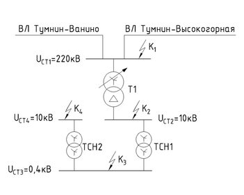 Для расчетов предоставлены узловая схема сети электроснабжения подстанций (см. рисунок 1.1) и параметры силового трансформатора ПС Тумнин (см. таблицу 1.1).