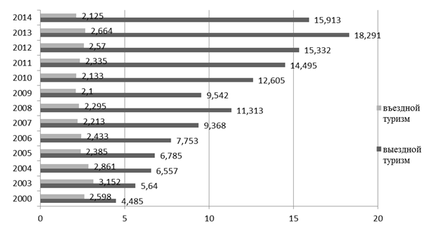 Рисунок 2.1 Динамика выездного и въездного потока с целью туризма за период с 2000 по 2014 гг., млн.чел.