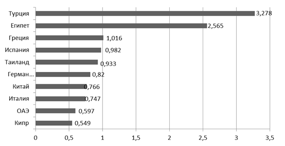 Рисунок 2.2 Топ-10 стран, популярных среди граждан РФ в 2014 г., млн.чел.