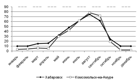 Рисунок 2.5 «Посещение леса жителями Хабаровска и Комсомольска-на-Амуре в 2010 г. по месяцам, кол-во посещений на 1 тыс. жителей (данные проекта ФОРЕСТ)»