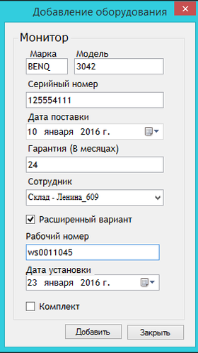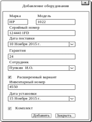 пользователь заносит информацию об оборудовании (бренд, модель, инвентарный и серийный номер и т.д.);
