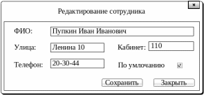 форма «Редактирование сотрудников» – позволяет изменять данные о сотруднике (его фамилию, адрес, рабочий телефон, рабочий адрес и кабинет). Эскиз формы изображен на рисунке 10;