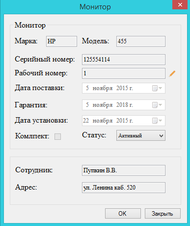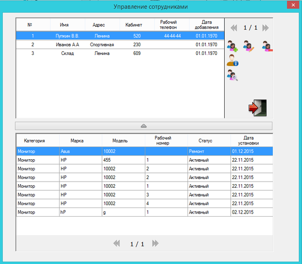 Справочник сотрудников состоит из двух блоков. В первом блоке содержится информация о сотруднике. Во втором блоке содержится информация о закрепленном оборудовании за выбранным сотрудником.