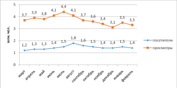 В 2015 году ежедневная аудитория сайта в рабочие дни составила в среднем 66 тысяч человек, еженедельная – до 500 тысяч человек, ежемесячная – около 1,5 миллионов человек. Динамика аудитории посетителей сайта представлена на рисунке 2.9.