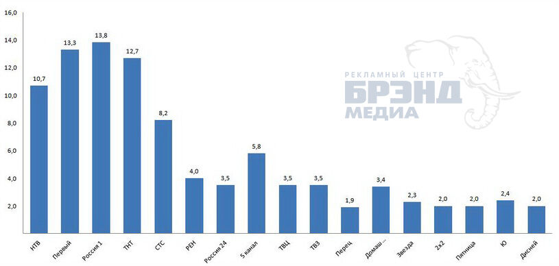 Из рисунка 3.2 видно, что наиболее просматриваемые каналы это: Россия 1, первый канал, ТНТ, НТВ. В таблице 3.5 указаны условия размещения рекламы (GRP) на период с 01.01.2015 по 31.12.2015. Цена указана за 1 пункт рейтинга при 100% плавающем размещения в офф - прайм23.