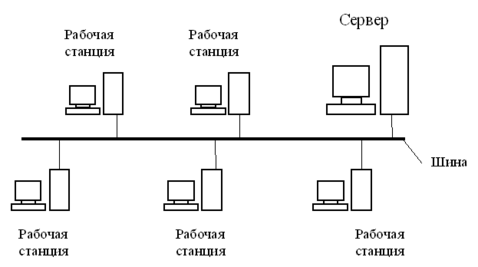 При топологии типа общая шина все клиенты подключены к общему каналу передачи данных (рисунок 3.2). При этом они могут непосредственно вступать в контакт с любым компьютером, имеющимся в сети.
