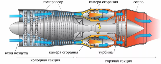 Воздух из окружающего пространства, забираемый и сжимаемый до заданного давления компрессором, непрерывным потоком направляется в камеру сгорания, куда через форсунки подается распыленное топливо. Газы, представляющие собой нагретый избыточный воздух в смеси с продуктами сгорания топлива, приводят во вращение турбину, являющуюся силовым приводом компрессора, и в случае двигателя с осевым компрессором поступают в форсажную камеру. В форсажной камере дожигается дополнительно подаваемое количество топлива, что позволяет достигнуть кратковременного увеличения тяги двигателя.