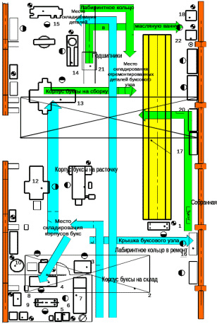 Описание последовательности работ по демонтажу, ремонту и монтажу буксовых узлов тепловоза 2ТЭ10. Слесарь подаёт колесную пару на повышенный путь накопитель рабочее место 1. Колесная пара с буксами попадает в моечную машину 3 проходного типа, где происходит мойка. После обмывки колесную пару попадает на участок демонтажа букс 1. Где производят внешний осмотр на наличие трещин в корпусах букс, крышках и сварочных швах. Слесарь отворачивает спускные пробки букс, сливают масло, Заворачивает пробки. Удаляет вязальную проволоку. Отворачивает болты. Снимают переднюю крышку. Разборка осевого упора происходит на рабочем месте 7. Отогнув шайбу, слесарь выворачивает болт, который не даёт соскользнуть буксе с оси. Снимает с шейки оси корпус буксы с блоками роликоподшипников и подает на место разборки буксы рабочее место 8. Снятые детали кладут в соответствующую тару и подают на обмывку в моечную машину тупикового типа 6. Удаляют смазку с внутренних колец роликоподшипников, дистанционного и лабиринтного кольца. Протирают насухо поверхность внутренних колец роликоподшипников ветошью. Повторяют операцию для буксы другой стороны колесной пары.