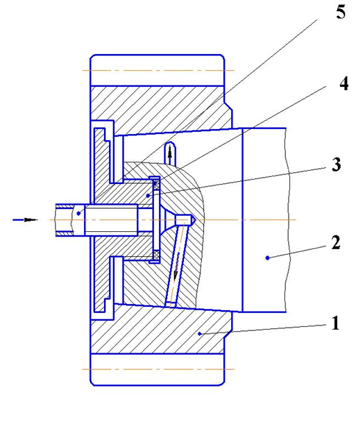 Слить масло из букс моторно – осевых подшипников перед снятием колесно – моторного блока с тележки электровоза. Снять колесно – моторный блок и разобрать его. Поставить на привалочных поверхностях букс моторно-осевых подшипников клеймо – номер, относящийся к соответствующему двигателю. Снять шестерни с концов вала двигателя. Чтобы снять шестерню 1 в соответствии с рисунком 7 с вала 2, установить на вал 2 гайку 3 с прокладкой 4; подсоединить трубку 5 гидронасоса и создать давление. После того, как шестерня сдвинется с места, снять ее, открутив предварительно гайку 3. Съем шестерни без гайки 3 запрещается.