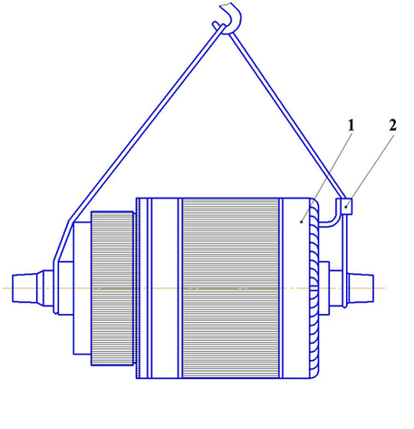 Для предохранения от повреждений обмотки транспортировку якоря 1 следует производить в соответствии с рисунком 1.6,используя специальный упор 2, который вставляется в два любых вентиляционных отверстия сердечника.