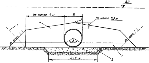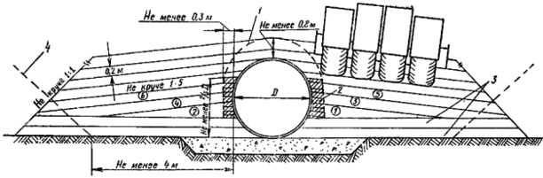 Грунтовая призма вокруг труб (рис. 2.6.) на ширине не менее 4,0 м с каждой стороны трубы и высотой не менее 0,5 м над верхом конструкции должна быть отсыпана дренирующим талым песчаным или гравелистым грунтом и уплотнена до коэффициента уплотнения не ниже 0,95. Грунт над трубой укладывают одновременно с обеих сторон на одинаковую высоту.