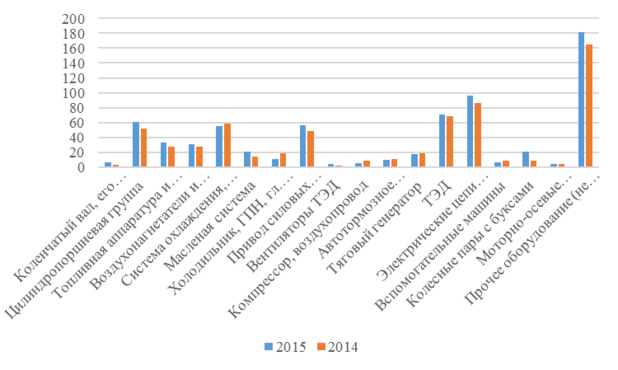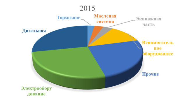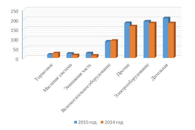 Рисунок 1.4 — Распределение неплановых ремонтов по основным узлам за 12 месяцев 2015-2014гг