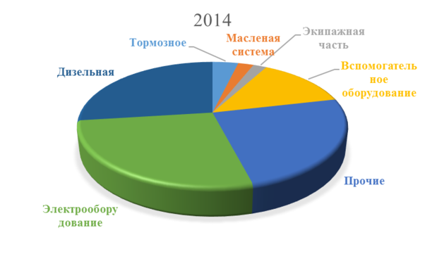 Рисунок 1.3 — Распределение неплановых ремонтов по группам оборудования за 12 месяцев 2014 года