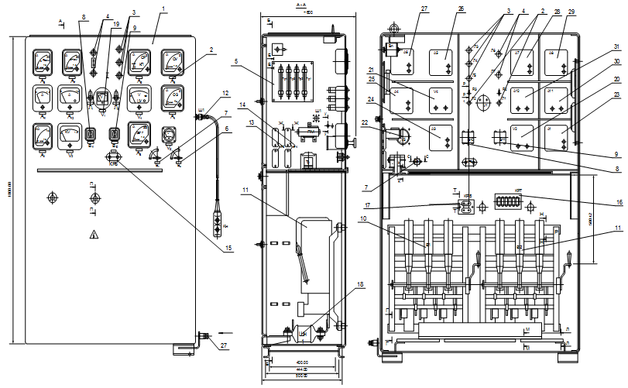Рисунок 1.7 — Пульт реостата тип Щ 01.01.00 (1. Пульт Щ01.01.00; 2.Сигнальная лампа Л1,Л2; 3.Сигнальная лампа Л3,Л4,Л5; 4.Сигнальная лампа Л6,Л7; 5. Плавкие вставки: ПР1,ПР2,ПР3,ПР4; 6. Выключатель В3; 7. Выключатель В4; 8. Переключатель В10; 9. Переключатель В11; 10. Автоматический воздушный выключатель В1; 11. Автоматический воздушный выключатель В2; 12. Штепсельный разъем Ш1 в металлическом корпусе; 13. Клеммовая рейка КР3; 14. Клеммовая рейка КР4; 15. Клеммовая рейка КР6; 16. Клеммовая рейка КР7; 17. Клеммовая рейка КР8; 18. Шунт ШН1; 19. Вольтметр V1; 20. Вольтметр V2; 21. Вольтметр V4; 22. Вольтметр V5; 23. Амперметр А1; 24. Амперметр А3; 25. Амперметр А4; 26. Амперметр А5; 27. Амперметр А6; 28. Амперметр А7; 29. Амперметр А8; 30. Амперметр А11; 31. Амперметр А12)