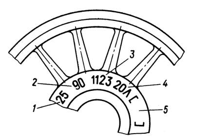 Рисунок Б4 – Знаки и клейма на колесном центре: 1 – условный номер предприятия-изготовителя, 2 – год (две последние цифры) изготовления, 3 – порядковый номер центра по системе нумерации предприятия-изготовителя, 4 – обозначение марки стали, 5 – клейма технического контроля предприятия- изготовителя и представителя заказчика