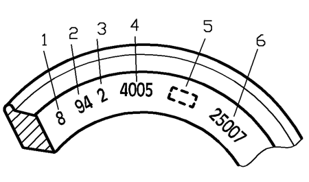 Рисунок Б3 – Знаки и клейма на наружной грани бандажа: 1 – условный номер предприятия изготовителя, 2 – год (две последние цифры) изготовления, 3 – марка бандажа, 4 – номер плавки, 5 – клейма приемки, 6 – порядковый номер бандажа по системе нумерации предприятия-изготовителя