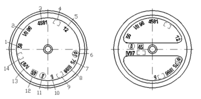 Рисунок Б2 – Знаки и клейма на правом торце оси колесной пары: 1 – условный номер предприятия-изготовителя необработанной оси; 2 – месяц (римскими цифрами) и год (две последние цифры) изготовления необработанной оси; 3 — порядковый номер оси; 4 — клейма технического контроля предприятия-изготовителя и представителя приемки, проверивших правильность переноса маркировки с необработанной оси и принявших обработанную ось; 5 – условный номер предприятия-изготовителя, обработавшего ось; 6 – клейма метода формирования колесной пары («ФТ» – тепловой, «Ф» – прессовый, «Ф» и «ТЗ» – комбинированный при прессовом методе посадки колес (колес-ных центров) и тепловом методе посадки зубчатого колеса на ось, «ТК» и «Ф» – комбинированный при тепловом методе посадки колес (колесных центров) и прессовом методе посадки зубчатого колеса на ось) или клеймо замены оси на вновь изготовленную («СО»); 7 – условный номер предприятия, производившего сборку колесной пары; 8 – месяц (римскими цифрами) и год (две последние цифры) сборки колесной пары; 9 – клейма технического контроля предприятия-изготовителя и представителя приемки, принявших колесную пару; 10 – клеймо балансировки; 11 – клейма переформирования колесной пары; 12 – номер ремонтного пункта, производившего переформирование; 13 – месяц (римскими цифрами) и год (две последние цифры) переформирования; 14 – клейма технического контроля ремонтного пункта и приемщика локомотивов (инспектора-приемщика), принявших колесную пару после переформирования