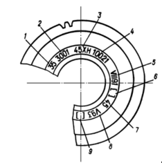 Рисунок Б5 – Знаки и клейма зубчатого колеса: 1 – условный номер предприятия-изготовителя, 2 – порядковый номер зубчатого колеса, 3 – марка стали, 4 – номер плавки, 5 – месяц (римскими цифрами) и год (две последние цифры) изготовления, 6 – клейма технического контроля предприятия-изготовителя и представители заказчика, 7 – условный номер предприятия, проводившего установку зубчатого колеса, 8 – месяц (римскими цифрами) и год (две последние цифры) установки, 9 – клейма технического контроля предприятия, проводившего установку