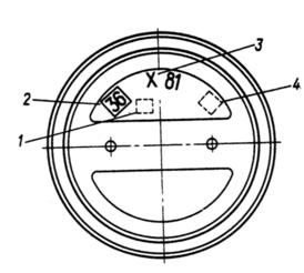 Рисунок Б6 – Знаки и клейма на левом торце оси: 1 – место постановки клейм замены бандажей, спрессовки левого или правого центра; 2 – условный номер ремонтного пункта; 3 – месяц (римскими цифрами) и год (две последние цифры) проведения полного освидетельствования; 4 – клейма службы технического контроля и приемщика локомотивов (инспектора-приемщика).