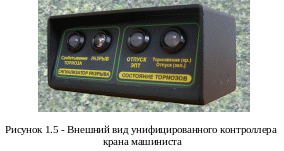 Для вывода показаний индикаторов локомотивной бригаде разработан унифицированный контроллер крана машиниста (рисунок 1.5). Контроллер применяется совместно с краном машиниста на локомотивах в качестве прибора управления тормозами и контроля тормозной системы поезда. Унифицированный контроллер реализует функции управления электропневматическими тормозами и контроля состояния тормозной системы поезда, автоматизирует выявление причины самопроизвольного срабатывания автотормозов в поезде, информирует локомотивную бригаду о работе сигнализатора разрыва.