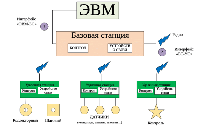 Исходя из поставленных задач, получаем структурную формулу демонстрационного модели комплекса, изображенную на рисунке 2.1. Комплекс состоит из базовой станции, подключаемой к ЭВМ. Базовая станция имеет органы управления, устройства связи, разъемы для подключения ЭВМ, программатора и других внешних устройств. Одно из удаленных устройств (далее ПП) управляет датчиками давления, получая команды через базовую станцию от ЭВМ. Другой ПП от подключенных к нему датчиков передает данные на ЭВМ через базовую станцию. Третий ПП управляет подключенным к нему роботом-рукой (контроллер).