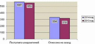 За 12 месяцев 2014 года из локомотивных депо поступило 567 телеграфных сообщений по выходу из строя гарантийных узлов и агрегатов, из них (рисунок 1.1 и плакат ДП 190301.65.09-Л-048.02): на ТПС – 450 шт., на линейное оборудование – 117 шт., (2013 году – 553 уведомлений, из них: на ТПС – 403 шт., на линейное оборудование –150 шт.). Общее количество поступивших телеграфных сообщений увеличилось на 14 шт. или 2,47%. Отнесено на вину завода 334 уведомлений (2013 год – 319 уведомлений).