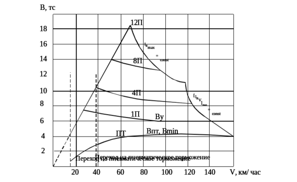 Отсюда резко возрастает тормозная сила, но как только она достигает значения, ограниченного предельной тормозной характеристикой (Iя· v)max = Const, вступает в действие канал ограничения тормозного тока по коммутации тяговых электродвигателей. Далее по мере уменьшения скорости движения ток возбуждения и ток якоря электродвигателей, а также тормозная сила будут увеличиваться, пока при скорости — 115 км/ч ток якоря не достигнет максимального значения. В этой точке предельной тормозной характеристики происходит смена работы каналов регулирования: канал ограничения тока якоря по коммутации электродвигателей закрывается и вступает в работу канал регулирования тока якоря IЯ max = Const. Когда скорость движения уменьшится до ~95 км/ч, вступит а работу канал регулирования тормозной силы Bφ = Const, а канал регулирования тока якоря закроется.
