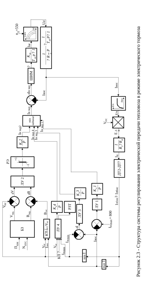 На рисунке 2.3 представлена структура системы регулирования электрической передачи тепловоза ТЭП70 в режиме ЭТ. Если машинист контроллером КМЭТ задаст определенную скорость движения при торможении, то вначале процесс торможения будет протекать аналогично описанному, т. е. по предельным тормозным характеристикам с ограничением тормозной силы в соответствии с положением переключателя тормозной силы ПТС. Однако как только фактическая скорость движения достигнет заданного значения, вступит в работу канал регулирования скорости v=Const. Далее при уменьшении скорости ниже заданной тормозная сила будет резко уменьшаться и наоборот. В результате с некоторой погрешностью будет поддерживаться заданная скорость движения.