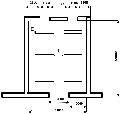 Схема расположения светильников на плане помещения представлена на рисунке 7.2. Ориентировочно устанавливается количество светильников по рекомендуемым расстояниям между светильниками и строительными конструкциями. Светильники устанавливаются вдоль длинной стороны помещения.