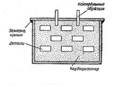 На дно ящика насыпают слой карбюризатора толщиной 30 – 40 мм; на него укладывают первый ряд деталей. Расстояние между деталями и между деталями и стеной ящика 20 – 25 мм. На первый ряд деталей насыпают слой карбюризатора толщиной 20 – 25 мм, укладывают следующий ряд деталей, снова засыпают карбюризатором, и так до полного заполнения ящика. Верхний ряд деталей засыпают слоем карбюризатора толщиной 20 – 35 мм, При упаковке деталей карбюризатор плотно утрамбовывают, сверху укладывают лист асбеста, ящик закрывают крышкой и обмазывают глиной. Через отверстия, имеющиеся в крышке, в ящик вставляют два указателя, служащие для контроля цементации.