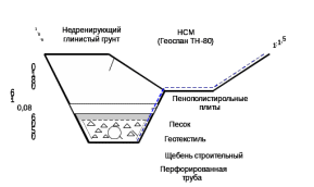 На дно траншеи укладывается водопроницаемый ТСМ (типа Дорнит). Геотекстиль укладывается с оставлением выпусков (запаса) материала, необходимого для выполнения обертывания дрены после обратной засыпки.