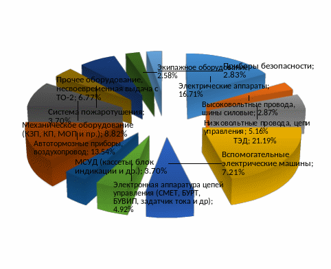В таблице 1.1 отражена количественная составляющая общего числа неисправностей локомотивов с распределением по оборудованию.