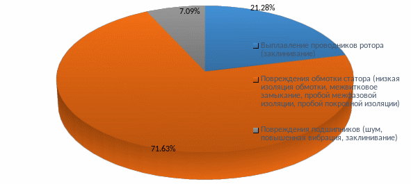 Согласно статистических данных причин отказов асинхронных электрических машин в СЛД-90 Приморское (рисунок 1.2), за период с января 2015 года по февраль 2017 года, можно отметить три основные причины, это повреждения обмотки статора, подшипников и выплавление проводников ротора (данная неисправность проявлялась исключительно в тех случаях, когда проводники ротора производились из алюминиевых сплавов).