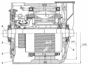 Рисунок 2.3 – Продольный разрез тягового двигателя НБ-514Б [15]: 1 – остов; 2 – траверса; 3, 5 – подшипниковые щиты; 4 – якорь