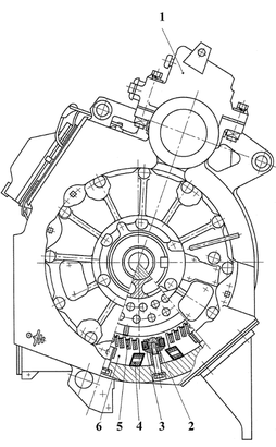 Рисунок 2.2 – Тяговый двигатель НБ-514Б [15]: 1 – МОП; 2 – сердечник дополнительного полюса; 3 – катушка дополнительного полюса; 4 – катушка главного полюса; 5 – катушки компенсационной обмотки; 6 – сердечник главного полюса