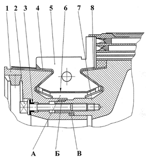 Рисунок 2.4 – Коллектор [15]: 1 – нажимной конус; 2 – скрепляющий болт; 3 – уплотняющая шайба; 4, 8 – изоляционные манжеты; 5 – комплект медных и изоляционных пластин; 6 – изоляционный цилиндр; 7 – втулка коллектора; А – коллекторная камера; Б, В – уплотнительные замки