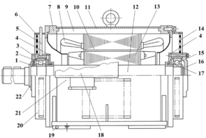 Рисунок 2.6 – Электродвигатель НВА-55: 1 – уплотнительное кольцо; 2 – роликовый подшипник №315; 3, 16 – наружная крышка подшипникового щита; 4, 17 – внутренняя крышка подшипникового щита; 5 – маслопровод; 6 –защитная сетка подшипникового щита; 7 – фланец станины; 8 – обмотка статора; 9 – ребро жёсткости станины; 10 сердечник статора; 11 – обшивка станины; 12 вал ротора; 13 – сердечник ротора; 14, 20 – подшипниковые щиты; 15 – шариковый подшипник; 18 – коробка выводов; 19 – болт заземления; 21 – станина; 22 – стопорное кольцо