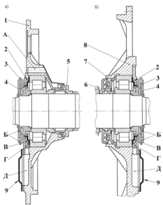 Рисунок 2.5 – Подшипниковые узлы ТЭД НБ-514Б [15]: а – со стороны коллектора; б – со стороны, противоположной коллектору; 1, 8 – подшипниковые щиты; 2 – уплотнительные кольца; 3 – подшипниковые крышки; 4 – лабиринтные кольца; 5, 6 – внутренних втулок; 7 – внутренней крышки
