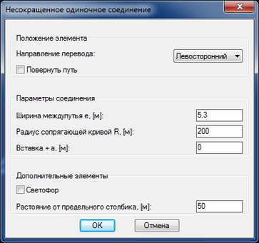 Блок «Параметры соединения» содержит основные данные для построения соединения. Если текстовое поле «Вставка + а» равно нулю, то соединение будет строиться от центра стрелочного перевода, исключая при этом отрезок «а» (рисунок 1).