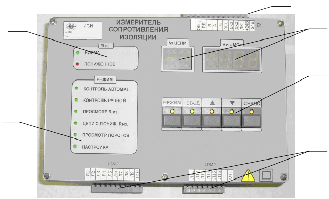 знакосинтезирующие индикаторы «№ ЦЕПИ» и «Rиз, МОм» для отображения номера контролируемой цепи и измеренного значения сопротивления Rиз;