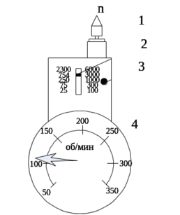 Периодический контроль частоты вращения и проверку стационарных тахометров производят механическим центробежным ручным тахометром (Рисунок 1.3), прижимая наконечник 1 к торцу вращающегося вала. В корпус 2 встроен редуктор с переключающим устройством, позволяющий менять передаточное отношение от наконечника 1 к чувствительному элементу для измерения в пяти диапазонах частоты вращения от 25 до 10000 об/мин. Переключают редуктор и устанавливают указатель 3 путем перемещения вдоль оси наконечника приводного вала при нажатой кнопке 4. В зависимости от установленного диапазона частоты вращения показания прибора определяют по одной из двух шкал. К преимуществам механических тахометров относится высокая точность показаний, а к недостаткам - невозможность дистанционного отсчета [1].