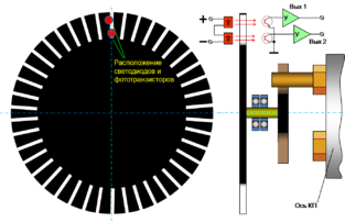 Диск-модулятор вращается синхронно с колесной парой. Фототранзистор, находящийся на одной оси со светодиодом, преобразует оптический поток в электрический сигнал.