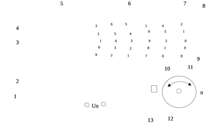 На валу 9 жестко закреплены храповое колесо 5 и цифровой барабан 7, а цифровые барабаны 6 свободно насажены на вал. Барабаны кинематически соединены между собой так, что при полном обороте каждого из них соседний слева разворачивается на 1/10 оборота. На каждый барабан нанесены цифры от 0 до 9. Таким образом обеспечивается десятичная система отсчета. Число читается в рамке прибора 8. Колесо 5 входит в зацепление с храповиком 3, который в одну сторону перемещается под действием пружины 4, а в другую – якорем 2 электромагнитной катушки 1. Катушка получает питание Uп от сети через герметичные контакты выключателя 13. В выключателе на пластинчатой пружине с контактом закреплен постоянный магнит 12. Выключатель крепится к корпусу двигателя таким образом, чтобы между якорем 12 и стальным штифтом 10 вала 11 был установлен зазор, обеспечивающий притягивание якоря и замыкание цепи питания катушки 1[1].