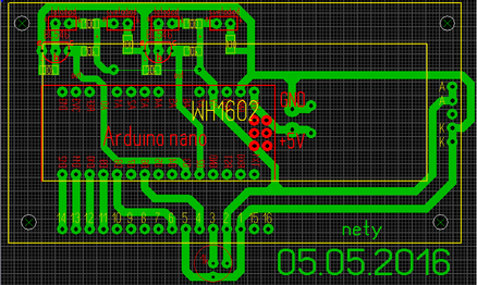 Для упрощения схемы сбора и подсоединения дисплея и микроконтроллера была создана плата (Рисунок 2.9), к которой крепится LCD дисплей и сам микроконтроллер Arduino. Эта плата делает конструкцию более компактной, исключая множество соединительных проводов. К этой плате припаивается провод питания, который будет запитывать все устройство и провода, идущие к датчикам с фото и светодиодами. И соответственно на плату устанавливается микроконтроллер и дисплей, отображающий показания оборотов двигателей. Эта плата создавалась в программе Sprint-Layout (Рисунок 2.10).