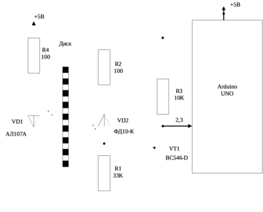 Принципиальная схема устройства заключается в подключении фотодиода к микроконтроллеру через транзисторный усилитель, а именно через транзистор VT1 BC546-D b и трех резисторов R1, R2, R3 (Рисунок 2.12). Запитываются они от микроконтроллера напряжением +5В. Питание поступает через резистор R2 на фотодиод VD2 и через резистор R1 уходит на землю. Через резистор R3 получает питание транзистор VT1 и далее питание уходит на землю. Получивший питание фотодиод VD2 передает полученные импульсы через транзистор VT1 на микроконтроллер. Питание получает светодиод через резистор R4 и уходит на землю. Светодиод VD1 подает импульсы через вращающийся диск с отверстиями на фотодиод VD2 через эти отверстия. Фотодиод VD2 передает полученные импульсы через транзистор VT1 на микроконтроллер Arduino UNO, где полученные импульсы обрабатываются и выдаются на монитор прибора [5].