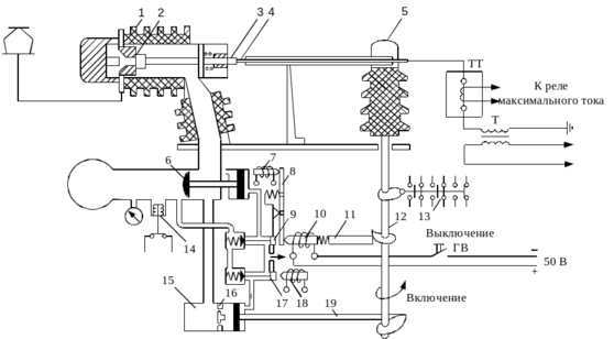 Рисунок 1.1 – Принципиальная схема главного выключателя: 1 – горизонтальный изолятор; 2 – подвижной контакт главного выключателя; 3 – неподвижный контакт разъединителя; 4 – подвижный контакт разъединителя (ножи); 5 – разъединитель; 6 – главный пусковой клапан; 7 – электромагнит с отключающей катушкой; 8 – рычаг главного выключателя; 9 – выключающий клапан; 10 – электромагнит с удерживающей катушкой; 11– толкатель;12 – вал; 13 – контрольно-сигнальный аппарат; 14 – реле давления; 15 – дополнительная полость; 16 – диафрагма; 17 – включающий клапан; 18 – электромагнит с включающей катушкой; 19 – шток.